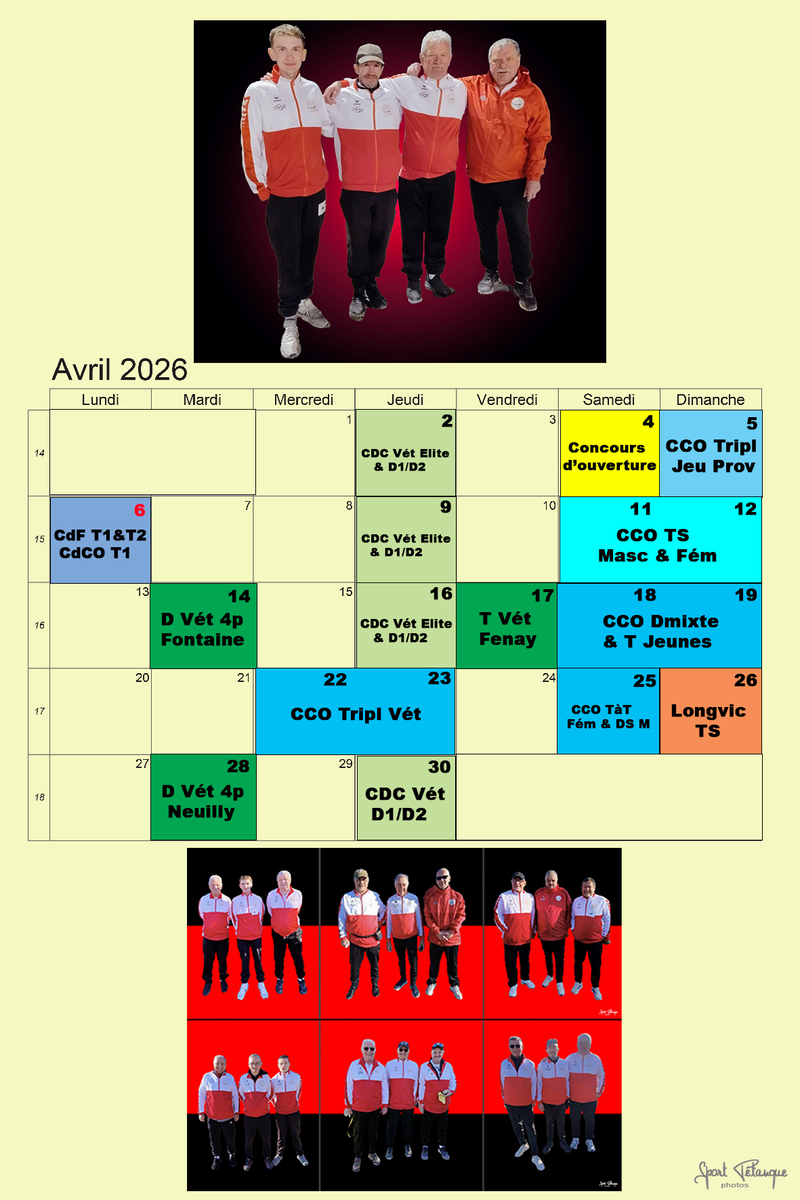 Affiche/ Calendrier du mois d'Avril, avec les photos de nos équipes qui se sont distinguées au CCO "Promotion" !