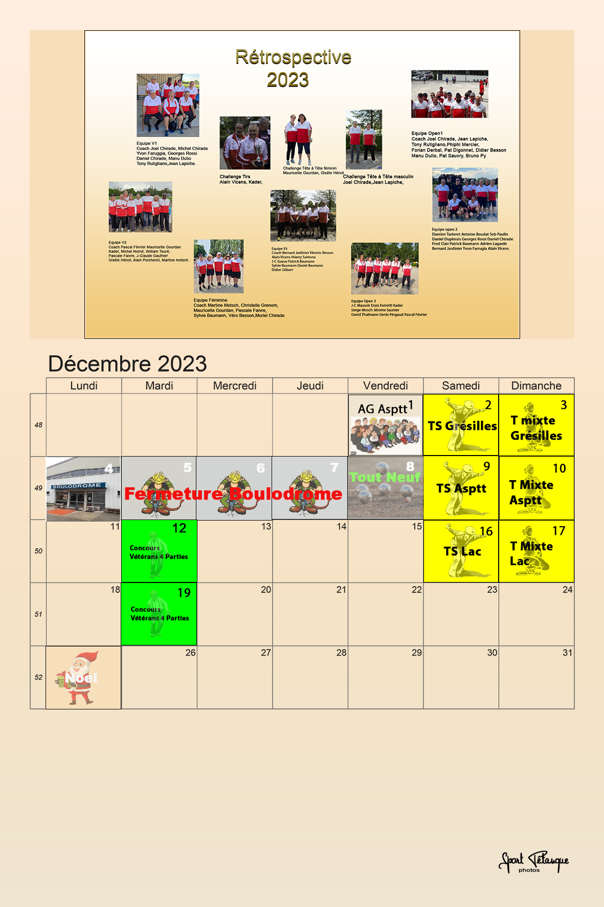 Désormais elles seront constituées avec un calendrier illustré du mois à venir, contenant les événements "boulistiques" , pouvant intéresser les joueurs et les joueuses du Club !
