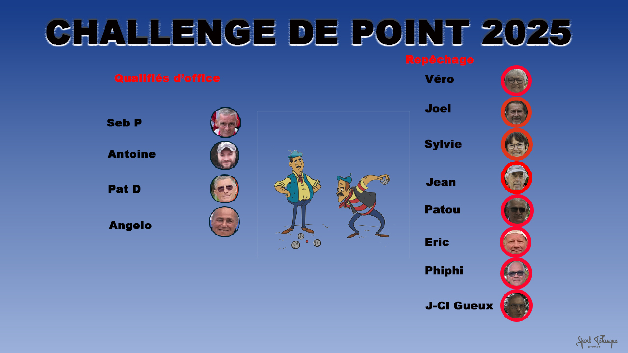 Repêchage : N°5 Véro 480+636=1116pts, N°6 Patou 530+663=1193pts, N°7 Jean 525+708=1233pts, N°8 J-Cl Gueux 576+767=1343pts, en attente suite Joel 510pts, Sylvie 525pts, Eric 548pts, Phiphi 559pts