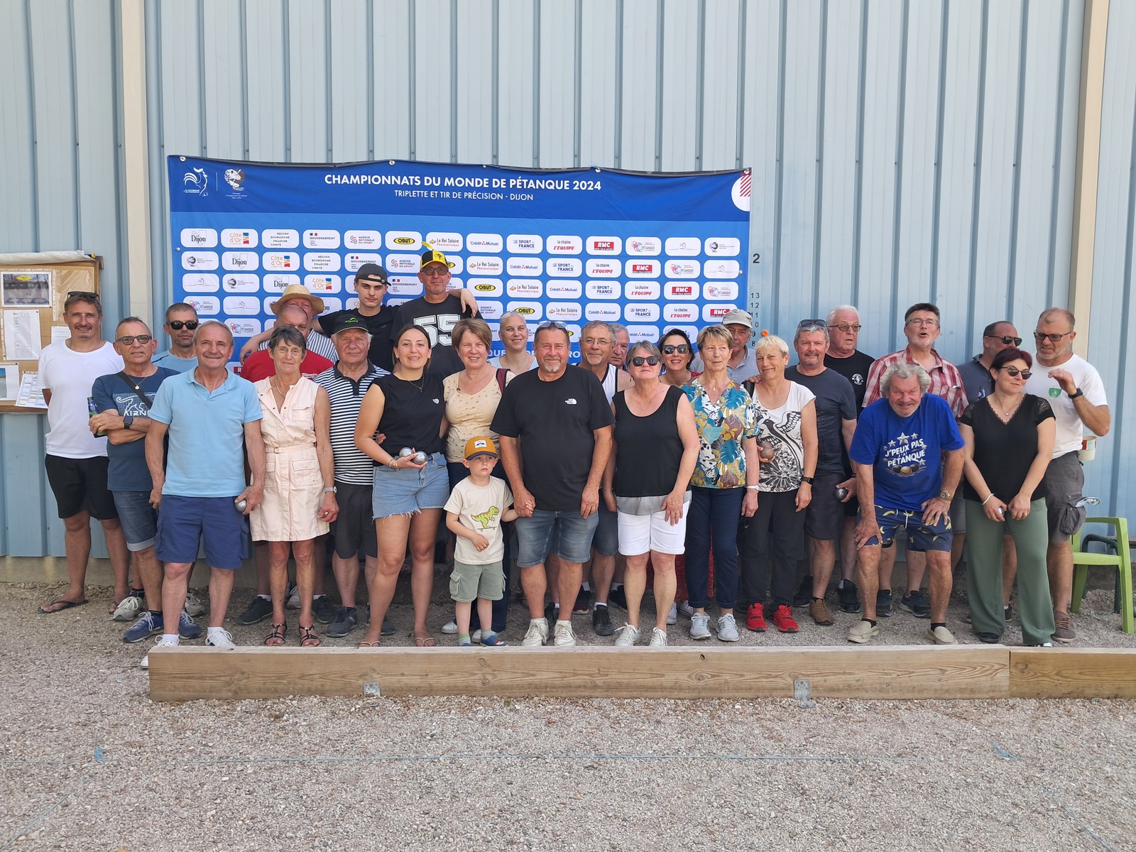 Journée chaude et ensoleillée disputée dans une ambiance très conviviale avec 48 joueurs et joueuses ! 4 parties effectuées sous la "férule" du Président Joel, avec un tirage dont lui seul a le secret !::