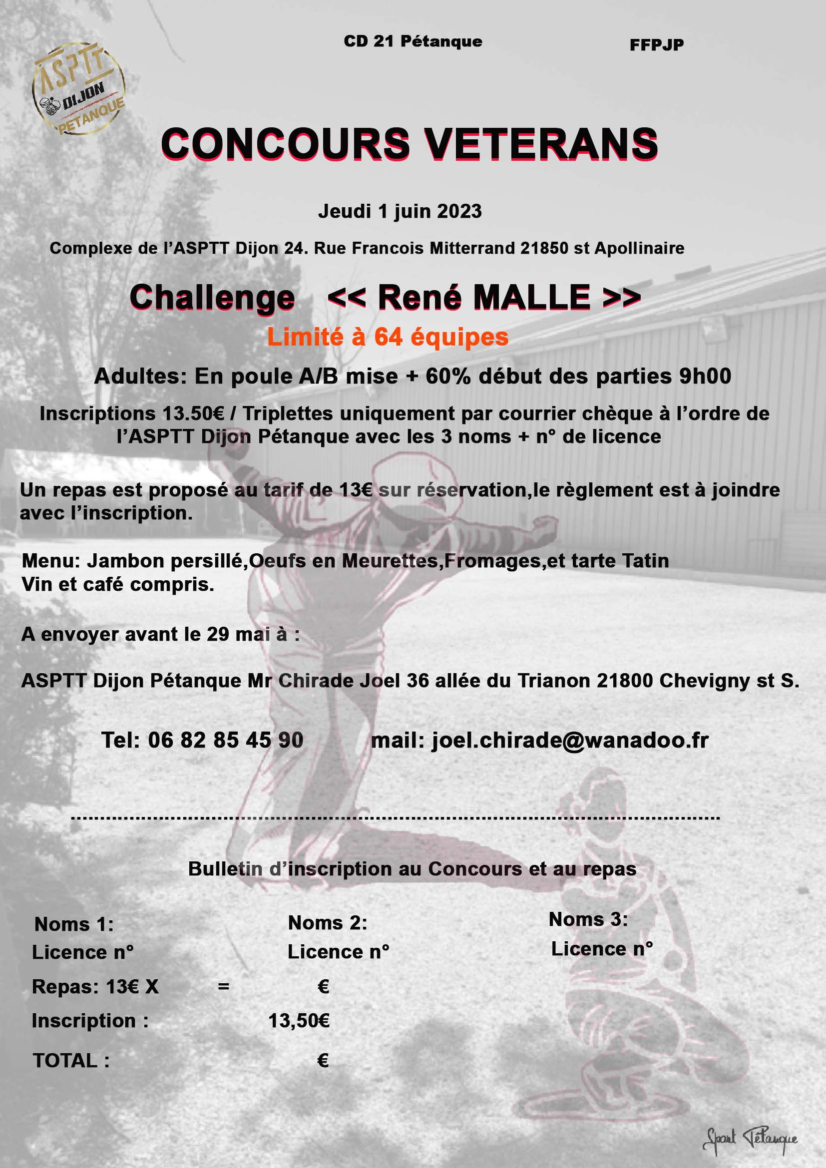Challenge "René MALLE" , site de l'ASPTT Dijon, 1er Juin , 46 équipes engagées voir les résultats .Vainqueur Jacques Crete, Grand Ami de notre ancien Président, accompagné de Gilles Poifol et Christian Beaumunier.