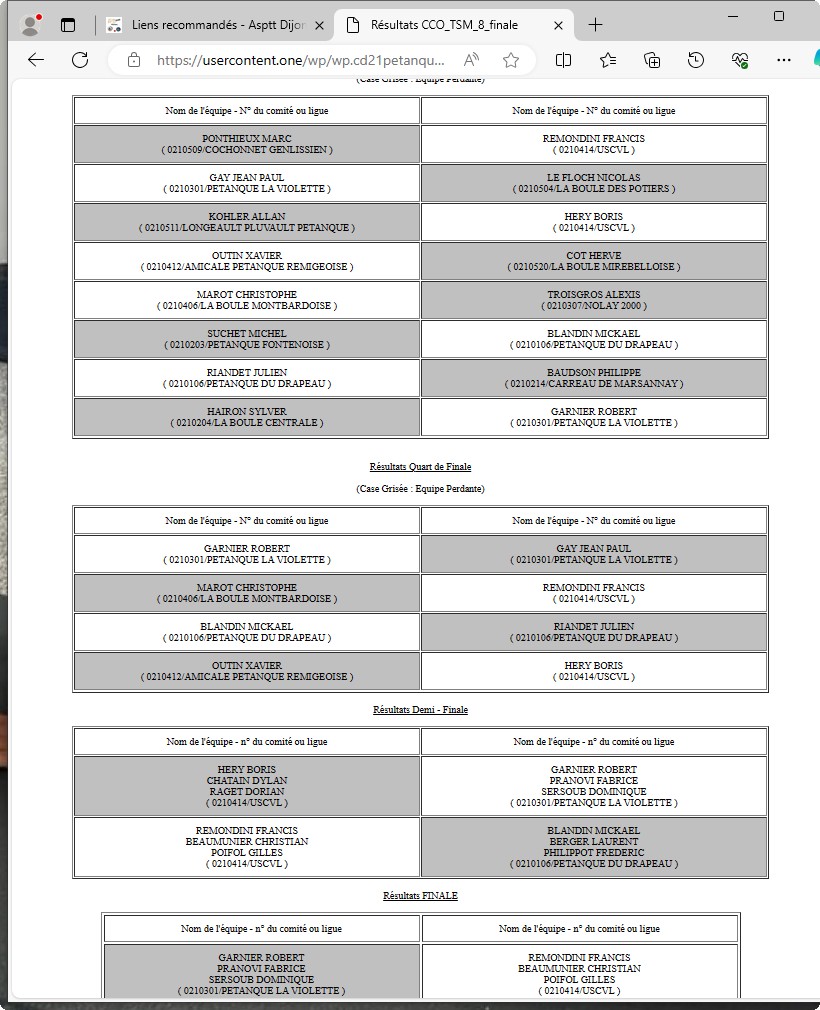 Asptt : 1) Pat Dig / Bruno P / Damien 2) Kader / daniel Ch / Jean 3) Pascal F / Phiphi / Davidos 4) Antoine / Enzo / Séb P 5) Tony / Pat S / Didier B
