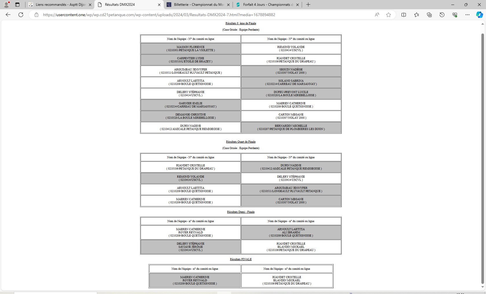 équipes Asptt en prévision : 1) Sylvie & Jean 2) Mauricette & Didier B 3) Christelle & Phiphi 4) Martine & J-Cl Gauthier 5) Gigi & Séb P 6) Brigitte & Doudou 7) Muriel & Joel
