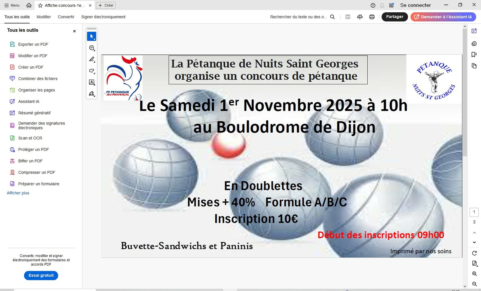 Nuits, Doublette Sénior au boulodrome de Dijon, début 10H, limité à 144 équipes, formule A/B/C ; voir affiche