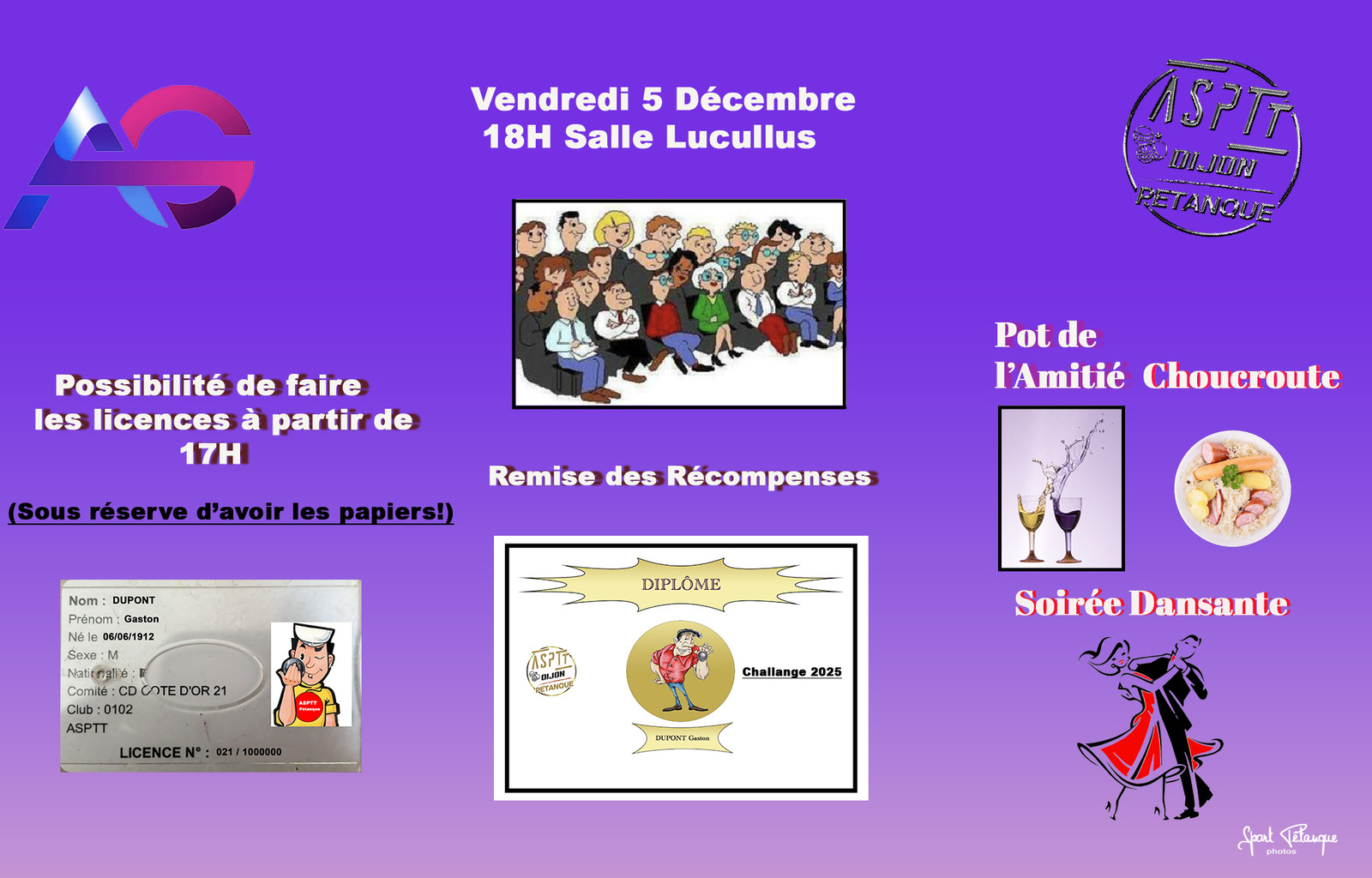 L'A.G se déroulera le vendredi 05 Décembre 2025 à partir de 18h00 à la salle Lucullus de l’ASPTT