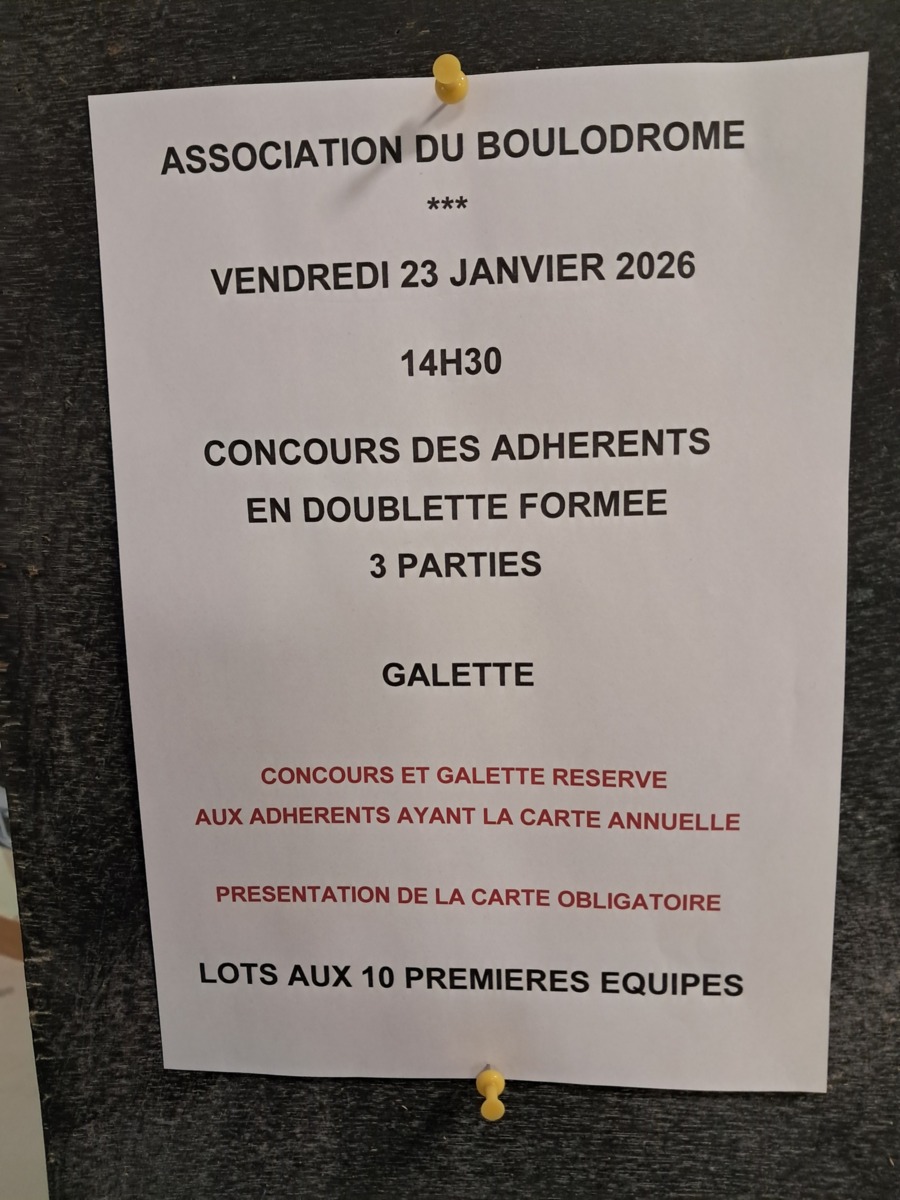 le Ven 23/1 14h30, concours des Adhérents / Galette organisé par l'Association du Boulodrome ; doublettes formées sur 3 parties ; avoir la carte adhérents du boulodrome; voir affiche