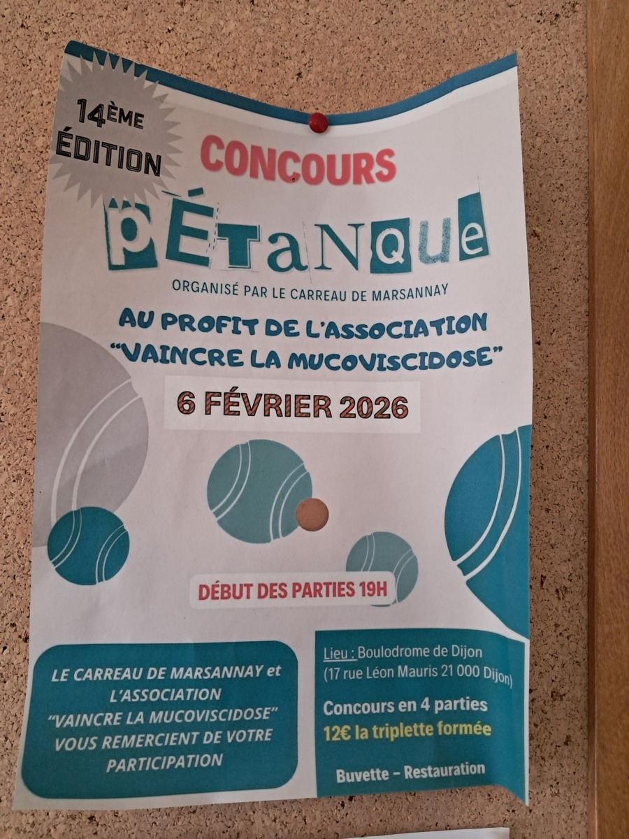 organisé par le "Carreau de Marsannay" au profit de l'Association "Vaincre la mucoviscidose" , Triplette 4 parties, début 19H . Voir affiche