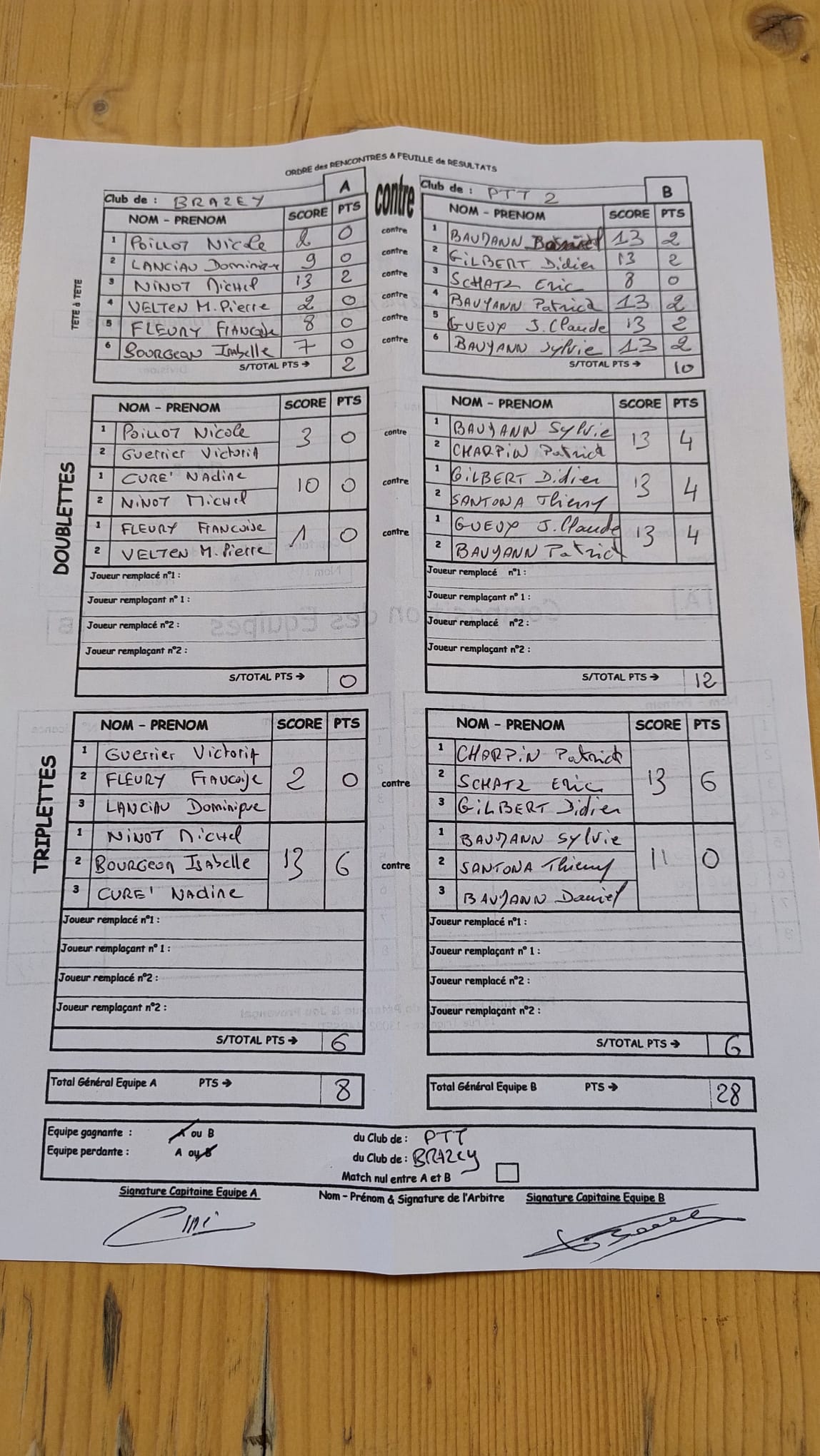 Le P'tit mot de Coach Patou : "Brazey dispose de très belles installations. Victoire contre une équipe composée essentiellement de féminines aussi sympathiques les unes que les autres, accompagnées d'un seul homme ! Bravo à elles d'avoir monté cette équipe pour pouvoir jouer leur saison. Super Accueil et encore une belle journée passée tous ensemble !"